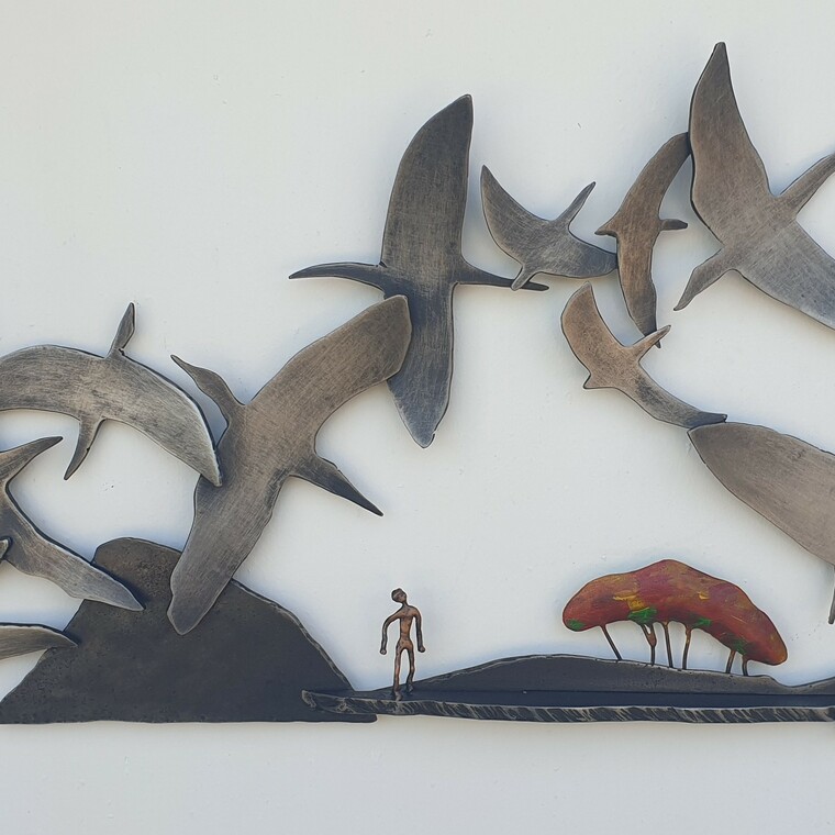 • [작가노트] 철로 만든 새들의 이야기 우리는 철의 차갑고 딱딱한 울타리 속 구조물에서 생활하며 살아간다 하여도 과언이 아니다. 이번 작업은 자유롭게 비행하며 날갯짓 하는 새들의 표현들을 우리가 살아가는 삶에 이야기들로 비유한 작품이다. 철의 선(線)속에서 조형적인 면(面)을 찾아가고 그 속에 생명의 점(點)을 찍어 형(形)상을 만들어가는 작업과정에서 즉흥적, 우연적으로 만난 철의 변화들을 딱딱한 구조물과 장식이 아닌 미술의 언어로 재해석하고 조형예술로 표출해 내는 작품들이다. 아마도 우리들 마음속 한 구석에는 철의 울타리를 벗어나 새들처럼 자유롭게 허공을 날고 싶은 욕망이 남아있을 것이다.