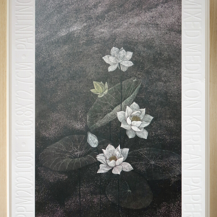 • [작가노트] 작업에 대하여 백색의 순지 위에 펼쳐지는 색감은 나에게 드넓은 자연의 공간이 된다. 그리고 그 위에서 펼쳐지는 다양한 색채들의 만남은 내가 살면서 느끼는 마음의 표현이 된다. 일상의 경험과 추억들은 여러 가지 색을 이용해 붓질로 화면에 펼쳐지고, 건조된 종이를 조심스럽게 구기며 균열 된 틈을 통해 드러나는 이전의 색들은 과거를 회상케 한다. 이 위로 등장하는 연과 개구리, 목련꽃들은 내가 담고 싶은 자연의 일부들이다. 나 또한 자연의 일부인 것이다. 이렇게 나는 자연의 위대함에 감사함을 느끼며 그 자연의 일부분들을 하나하나씩 꺼내어 나의 화면공간에 기록해 나가고자 한다. 누구에게나 품고 있는 소중한 기억들이 있다. 나에게 있어 소중한 기억은 엄마가 되면서 내 옆에 딱 붙어버린 청개구리 같은 아들과 하루하루 복닥거리면서 만들어 내는 추억들이 화면에서 펼쳐진다. 드넓은 연잎 위, 나무 위에서 먼곳으로의 도약을 꿈꾸는 개구리의 모습은 엄마와 아들의 모습과도 같다. 아이의 안전을 바라며 엄마의 넓은 뜰에서 즐겁게 뛰놀고, 아이는 아무런 걱정 없이 이곳저곳을 마음 놓고 뛰어놀 수 있는 행복과 감사의 존재이다.