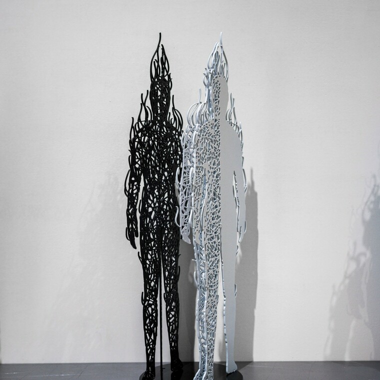 • [작가노트] Space IDEA 2025 – 본질의 사유(김정희) 몇 해 전, 지인이 건넨 오래된 수세미 하나가 내 작업의 방향을 근본적으로 뒤흔들었다. 말라버린 껍질 속, 얽히고설킨 다층적 구조와 생의 흔적은 마치 오랜 시간 축적된 우주의 질서처럼 느껴졌다. 작은 자연물 안에 펼쳐진 복잡한 조형은 단지 생물학적 결과가 아닌, 생명과 공간, 시간과 구조가 맞물린 하나의 세계 질서였다. 그 순간, 공간은 내게 단순한 배경이나 조형의 무대가 아니라, 생명이 깃든 살아 있는 장(場)으로 다가왔다. 그것은 플라톤이 말한 ‘이데아의 세계’ 처럼, 물질 너머에 존재하는 본질을 향한 시각적 은유이자, 내가 조각이라는 매체로 도달하고자 했던 근원적 질문의 실마리였다. 조각가에게 공간은 늘 어려운 주제였다. 그러나 수세미를 통해 나는 공간을 단지 비워진 여백이 아니라, 에너지와 존재, 그리고 시간의 흔적이 교차하며 ‘의미를 생성하는 장’으로 바라보게 되었다. 이로써 조각은 실체의 구축이 아닌, 존재의 지각(Perception)과 그 본질을 포착하는 ‘사유의 조형’이 된다. 이번 전시 「Space IDEA 2025 – 본질의 사유」는 내가 지난 몇 년간 붙잡아온 근원적 질문들에 대한 응답이다. 나는 철사라는 선적인 재료를 통해 인체를 형상화한다. 그러나 그 안은 비어 있다. 비워낸 실체 위에 세워진 선들은 단지 형상을 구성하는 윤곽이 아니라, 보이지 않는 에너지의 흐름과 정신의 진동을 시각화하는 구조이다. 이는 단단한 육체를 해체하고, 그 너머에 있는 존재의 본질—즉 보이지 않지만 ‘느껴지는 것’—을 드러내려는 시도이다. 메를로-퐁티가 말한 것처럼, 우리는 세계를 보는 것이 아니라 느끼며 인식한다. 내 조각 속 ‘비워진 인체’는 그 자체로 지각의 대상이기보다는 지각의 장이 된다. 선들은 그 장 안에서 정신의 흐름, 시간의 압축, 그리고 무의식의 떨림을 시각화한다. 특히 이번 전시에서는 수세미에서 출발한 철사 조형물을 통해, 인간과 자연, 그리고 우주의 상호 연결성과 순환성을 보다 직접적으로 드러내고자 했다. 그물망처럼 구성된 철사 구조는 들뢰즈가 말한 리좀(rhizome) 구조를 떠올리게 한다. 위계나 중심 없이 끝없이 퍼지고 얽히는 선들 속에서, 나는 생명과 시간, 존재의 흔적을 직조해낸다. 공간에 전시된 작업에서는 인간과 자연, 자아와 타자, 실재와 상상의 경계가 모호하게 뒤섞이는 지점을 형상화했다. 뫼비우스의 띠를 연상케 하는 조형 구조 속, 한쪽은 인간의 형상, 반대편은 추상화된 인물로 구성되어 있다. 이 구조는 대립적 이항을 넘어서, 존재가 고정되지 않고 끊임없이 생성되고 변화하는 **과정적 존재성(being-in-process)**을 이야기한다. 작품은 관객의 시선을 되돌려 ‘나’를 보게 하며, 인식과 지각의 주체로서의 자신을 다시 자각하게 만든다. 나는 관객이 단지 작품을 보는 존재가 아니라, 작품에 의해 ‘보이는 존재’가 되기를 바란다. 결국, 이 모든 작업은 ‘나’라는 존재로부터 출발한다. 나의 의도와 상관없이, 타인의 시선은 새로운 해석을 만들어낸다. 플라톤의 이데아가 감각 세계를 넘어선 참된 실재라면, 나는 그 감각과 실재 사이의 간극을 철사의 선으로 연결하고자 한다. 이번 전시는 나에게 있어 하나의 전환점이다. 조각이라는 매체를 통해 자연의 생명성과 인간 존재의 깊이를 동시에 사유하고자 했다. 그 속에서 공간은 단지 형상을 담는 그릇이 아닌, 존재와 에너지가 끊임없이 충돌하고 생성되는 철학적 무대가 된다. 이 작업들이 관객에게도 본질에 대한 질문을 던질 수 있기를 바라며, 멈춰 서서, 그 선들과 공간 사이에서 ‘자신’이라는 존재를 새롭게 마주하게 되기를 바란다. 그것이 바로, 내가 이 조각을 통해 그리고자 한 사유의 여정이다.