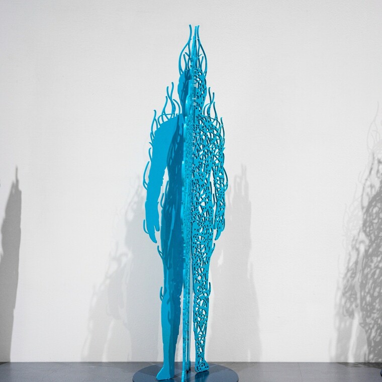 • [작가노트] Space IDEA 2025 – 본질의 사유(김정희) 몇 해 전, 지인이 건넨 오래된 수세미 하나가 내 작업의 방향을 근본적으로 뒤흔들었다. 말라버린 껍질 속, 얽히고설킨 다층적 구조와 생의 흔적은 마치 오랜 시간 축적된 우주의 질서처럼 느껴졌다. 작은 자연물 안에 펼쳐진 복잡한 조형은 단지 생물학적 결과가 아닌, 생명과 공간, 시간과 구조가 맞물린 하나의 세계 질서였다. 그 순간, 공간은 내게 단순한 배경이나 조형의 무대가 아니라, 생명이 깃든 살아 있는 장(場)으로 다가왔다. 그것은 플라톤이 말한 ‘이데아의 세계’ 처럼, 물질 너머에 존재하는 본질을 향한 시각적 은유이자, 내가 조각이라는 매체로 도달하고자 했던 근원적 질문의 실마리였다. 조각가에게 공간은 늘 어려운 주제였다. 그러나 수세미를 통해 나는 공간을 단지 비워진 여백이 아니라, 에너지와 존재, 그리고 시간의 흔적이 교차하며 ‘의미를 생성하는 장’으로 바라보게 되었다. 이로써 조각은 실체의 구축이 아닌, 존재의 지각(Perception)과 그 본질을 포착하는 ‘사유의 조형’이 된다. 이번 전시 「Space IDEA 2025 – 본질의 사유」는 내가 지난 몇 년간 붙잡아온 근원적 질문들에 대한 응답이다. 나는 철사라는 선적인 재료를 통해 인체를 형상화한다. 그러나 그 안은 비어 있다. 비워낸 실체 위에 세워진 선들은 단지 형상을 구성하는 윤곽이 아니라, 보이지 않는 에너지의 흐름과 정신의 진동을 시각화하는 구조이다. 이는 단단한 육체를 해체하고, 그 너머에 있는 존재의 본질—즉 보이지 않지만 ‘느껴지는 것’—을 드러내려는 시도이다. 메를로-퐁티가 말한 것처럼, 우리는 세계를 보는 것이 아니라 느끼며 인식한다. 내 조각 속 ‘비워진 인체’는 그 자체로 지각의 대상이기보다는 지각의 장이 된다. 선들은 그 장 안에서 정신의 흐름, 시간의 압축, 그리고 무의식의 떨림을 시각화한다. 특히 이번 전시에서는 수세미에서 출발한 철사 조형물을 통해, 인간과 자연, 그리고 우주의 상호 연결성과 순환성을 보다 직접적으로 드러내고자 했다. 그물망처럼 구성된 철사 구조는 들뢰즈가 말한 리좀(rhizome) 구조를 떠올리게 한다. 위계나 중심 없이 끝없이 퍼지고 얽히는 선들 속에서, 나는 생명과 시간, 존재의 흔적을 직조해낸다. 공간에 전시된 작업에서는 인간과 자연, 자아와 타자, 실재와 상상의 경계가 모호하게 뒤섞이는 지점을 형상화했다. 뫼비우스의 띠를 연상케 하는 조형 구조 속, 한쪽은 인간의 형상, 반대편은 추상화된 인물로 구성되어 있다. 이 구조는 대립적 이항을 넘어서, 존재가 고정되지 않고 끊임없이 생성되고 변화하는 **과정적 존재성(being-in-process)**을 이야기한다. 작품은 관객의 시선을 되돌려 ‘나’를 보게 하며, 인식과 지각의 주체로서의 자신을 다시 자각하게 만든다. 나는 관객이 단지 작품을 보는 존재가 아니라, 작품에 의해 ‘보이는 존재’가 되기를 바란다. 결국, 이 모든 작업은 ‘나’라는 존재로부터 출발한다. 나의 의도와 상관없이, 타인의 시선은 새로운 해석을 만들어낸다. 플라톤의 이데아가 감각 세계를 넘어선 참된 실재라면, 나는 그 감각과 실재 사이의 간극을 철사의 선으로 연결하고자 한다. 이번 전시는 나에게 있어 하나의 전환점이다. 조각이라는 매체를 통해 자연의 생명성과 인간 존재의 깊이를 동시에 사유하고자 했다. 그 속에서 공간은 단지 형상을 담는 그릇이 아닌, 존재와 에너지가 끊임없이 충돌하고 생성되는 철학적 무대가 된다. 이 작업들이 관객에게도 본질에 대한 질문을 던질 수 있기를 바라며, 멈춰 서서, 그 선들과 공간 사이에서 ‘자신’이라는 존재를 새롭게 마주하게 되기를 바란다. 그것이 바로, 내가 이 조각을 통해 그리고자 한 사유의 여정이다.