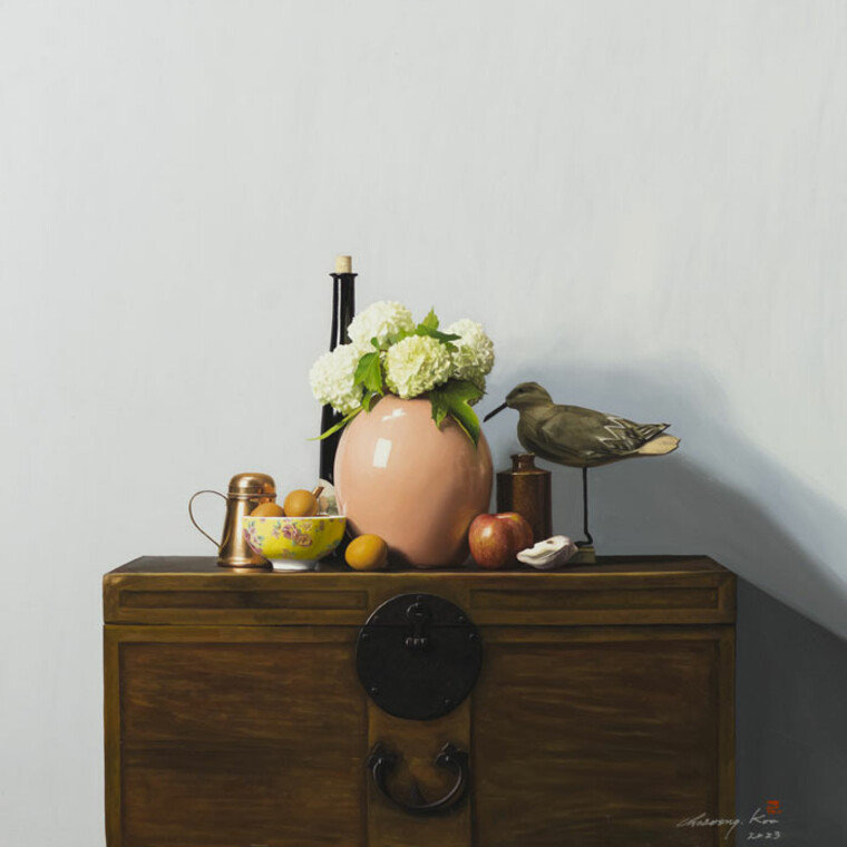 • [작가노트] 그림을 그리는 작업은 새로운 꿈을 꾸는 것이다. 거기 그 사물(being)이 그 적절한 자리에서 하나의 필수 불가결한 아름다운 대상이 되는 것, 그 대상들 하나하나가 나의 분신이 되고, 내 잃어버린 꿈의 파편이 된다. 떠도는 일상의 사물들이 새로운 이름을 주고, 더 아름답게 자리매김할 수 있도록 해 주고 싶다. 그들 각자는 이미 생명을 상실했지만, 하나의 그림이라는 공간에 놓여 짐으로 의미있는 시적 오브제의 재 탄생을 본다. 숨을 쉬는 그림, 그 대상들이 주는 더 미세한 호흡을 찾고 싶다. 마치 그려놓은 대상이 무생물체가 아닌, 무수한 꿈의 파편들이 부서져 그 잔해의 흔적을 극복하고 온전한 오브제가 되기까지 말이다. 상처 투성이의 아픈 심장을 가진 정물들을 나는 나의 그림 속에서 치유한다. 가장 께끗하고 온전한 것으로 표현되어 새로운 힘을 잉태하고 다시 하나의 커다란 힘에 응집되는 새로운 조화와 질서 위에 놓여지길 원한다. 나 스스로도 개입하길 원치않는 단지 거기 그 자리에 그들을 높여주는 일을 할 뿐이다. 그래서 굳이 내가 그들을 통해 무언가 말하려 하지 않아도 된다. 이 리얼리티의 벼랑 끝에서 그것들은 이미 현실의 being 이 아닌 것이다.제 2의 being 이 작품속에서 잉태하는 것이다. 작가 자신은 이제 붓을 내려놓는 이방인일 뿐이다. 작품이 자신들의 자리매김과 저마다의 색깔로 빛을 발할 때 쯤이면 나는 가끔 호흡을 멈춘다. 그들이 호흡하기 때문이다. 하나의 힘 안에 응집된 그들만의 질서, 거기 그 자리에 있어 흔들리지 않는 조화의 아름다움, 사물들 각자가 자존심을 회복하고, 어느날 아침 내가 눈을 떳을 때 그 미지의 공간에 그것들이 사라져 버릴 것 같은 두려움 때문이기도 하다. 새로운 자아의 탄생, 허물을 벗는 새로운 잉태, 벌거벗은 나신의 미지의 순수한 유혹, 그 낯선 시선 속에서 우리를 자각케 하고 체험케 한다. 혹 지나치기 쉬운 사실 안에서 가장 바른 사실의 긍정, 결코 억압하지 않고 자유로울 수 있는 자기 망각의 공간, 결코 세상에 존재하지 않는 참 긍정의 꿈의 영역,이것이 내가 표현하고자 하는 “사실”의 세계이다.