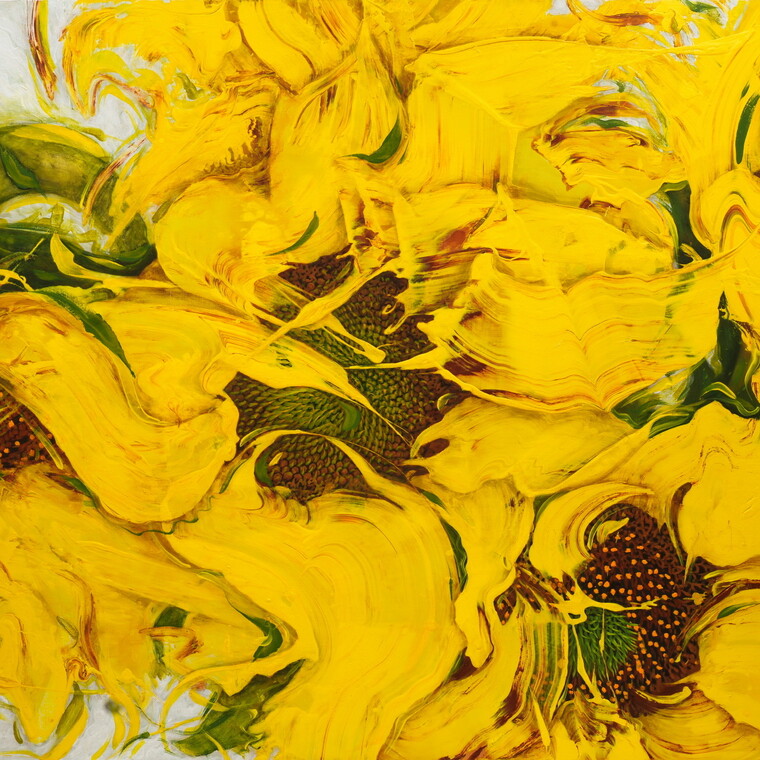 • [작가노트] 흔들리는 해바라기, 흔들림은 발산이고 움직이며, 그것은 모든 생명의 에너지이다. 한 여름 뙤약볕을 안고 목을 길게 빼어 태양을 바라고 있는 해바라기는 열정과 인내와 연모의 상징이다. 적극적이고 진취적인 태양을 닮아가는 해바라기는 나에게 위엄과 열정으로 다가왔다. 어려운 환경을 극복하고 화려하게 피어나는 해바라기는 나의 성격과 인생행로와 닮아 사랑하지 않을 수 없다. 무엇보다 그 열정적인 해바라기가 바람에 휘날리는 모습을 보고 느끼고 그림으로 표현할 때마다 내가 살아있고 자유로움을 느낀다. 속도와 힘을 실은 붓질(brushing)이나 자유로운 손가락 작업, 흩뿌려진 얼룩점은 내 기질의 소산(所産)이며 나의 감성과 사유를 표현하기 위한 형식적 요소로서 언제나 작용한다. 이러한 조형적 형식 속에 해바라기는 바람을 만날 때 더 열정적 에너지와 강렬한 생명력의 이미지로 용융(熔融)되어있다. [평론] 윤옥순의 작품세계는 동양의 사유세계에서 말하는 우주 만물의 원리이자 근원인 “이(理)와 기(氣)”, 그중에서도 기(氣)”의 조형화에 있다. 그의 예술세계를 구축하는 생명의 근원으로서의 기(氣)”를 열정의 이미지로 표현하는 데 있다. 윤옥순 작가의 작업은 무엇보다 속도감이 느껴지는 빠른 붓질로 시작되는 움직임이나 호흡을 암시하는 듯한 이미지, 그리고 붓질은 우주의 충만한 에너지 혹은 우주 만물의 근원적인 힘의 흐름과 또 화면의 구성이나 여백의 활용에 있어서도 매우 동양적이다. 즉 기본적으로 이미지를 모티브로 하되 그것을 붓글씨 쓰는 서체의 느낌으로 당기고 끌어올리는 패턴을 구사하면서 공간을 배려하고 있다. 그러면서도 즉흥적이고도 고조된 감성에 의존한다. 자유분방하고 분출하는 듯한 그의 붓질은 인간 내면의 깊은 곳에서 일어나는 원초적이고도 강렬한 열정의 표출로써 회화 이상의 또 다른 생동감을 준다. 그녀의 붓질은 우주에 충만한 에너지 혹은 우주 만물의 근원적인 흐름을 자기만의 조형 언어로 표현한 것이다. 그녀가 구성한 독특한 화면의 형태들은 기본적으로 률과 함께 생명감을 보여주는 열정의 이미지이다. -개인전서문(2003)중에서 김종근 미술평론가