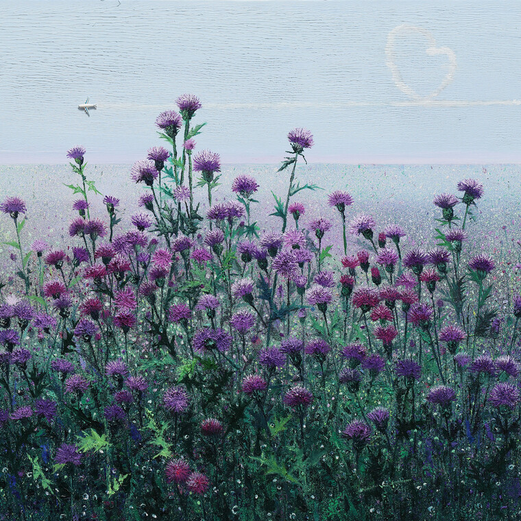 • [평론] 이명화, 엉겅퀴 이야기 이명화는 산과 들이라면 어디든지 볼 수 있는 엉겅퀴를 모티브로 삼는다. 어찌보면 너무 흔해서 사람들의 주목을 잘 받지 못할 수도 있지만 이명화에게는 각별한 존재이다. 작가가 쓴 ‘소멸, 그 아름다움’이란 글에는 이런 생각이 잘 담겨 있다. “구름 한 점 없는 산길, 타는 듯한 햇볕이 내려 쬐는 길가에 핀 엉겅퀴를 본적이 있나?그 타는 듯한 太陽 아래서 가시를 달고 있는 짙푸른 이파리의 엄격함, 화산에서 붉은 용암이 솟아 나오는 듯한 요염한 불꽃 같은 꽃, 농염한 아름다움과 고혹적인 색감에 매료된다.” 이명화는 유년시절 경상북도 안강이란 마을에서 자라나 어렸을 적부터 산과들의 자연물들을 벗삼아 지내왔다. 성인이 돼서 그곳을 떠나왔지만 언제나 그의 가슴속에는 안강의 뚝방길에서 뛰어 놀았던 즐거운 시절과 들판에 만개하였던 들꽃들이 남아있다. 안강은 추억의 원본이자 순결한 냄새가 풍기는 곳이다. 그의 그림은 이처럼 고향에 관한 추억에서 싹을 틔우고 또 길어올려지고 있다. 그의 작품을 추적해가면 그의 심상을 파악할 수 있는데 가령 2002년에는 들판속의 야생화를 비롯하여 해바라기, 맨드라미 등을 다루었고, 2004년의 노송, 2005년에는 주로 정물화를 통해 화사하게 피어난 꽃들을 즐겨 다루었다. 2009년에는 단 한차례 예외적으로 여성의 장신구를 다룬 개인전을 열었을 뿐 대부분의 테마는 야생화와 식물에 초점이 맞추어져 있다. 이번 전시의 출품작은 엉겅퀴만을 대상으로 하고 있다는 점에서 지금까지의 기조를 이어가고 있는 것으로 파악된다. 작품에 등장하는 엉겅퀴는 작가가 산행에서 만난 것들로 오서산,치악산, 지리산 칠보산, 칠장산, 군자산, 속리산 등지를 여행하면서 산중에 핀 엉겅퀴를 카메라에 담았다가 스튜디오에 돌아와 그것을 그린다고 한다. 그의 엉겅퀴는 대체로 흐릿한 풍경을 후경으로 삼고 있다. 산중턱 또는 정상에 올라 내려다본 풍경이랄 수 있으며 전면에는 예외없이 엉겅퀴가 자리잡고 있다. 작가는 엉겅퀴를 ‘요염한 불꽃같은꽃’으로 묘사하였지 만 사실 그 꽃은 가시가 나있어 만질 수 없으며, 이파리는 무슨 사연이 그렇게 많은지 톱날처럼 날카로운 돌기로 보는 사람에게 경고신호를 보내고 있다. 짓궂은 손에 괴롭힘을 당한 탓일까, 거센 바람과 찬공기에 시달리고 움추리며 살아오면서도 연분홍꽃을 피어낸 엉겅퀴, 그러기에 엉겅퀴의 존재는 더없이 귀해 보인다. 핏빛 면류관을 둘러쓴 엉겅퀴는 우리에게 아픔 없이 사랑할 수 있느냐고, 눈물 없이 사랑하겠느냐고 되묻는 것같다. 그림에 핀 엉겅퀴는 웅장하거나 화려하지 않지만 그 삶의 여로를 돌이켜 보면 숙연해진다. 작가의 그림에는 황금기를 보낸, 하얀 보풀이 휘날리는 엉겅퀴도 자주 눈에 띈다. 흰털에다 씨를 실어 주위로 날리며 겨울채비를 서두른다. 가을의 엉겅퀴는 그야말로 추레한 모습일 수밖에 없다. 여름철의 전성기에 비하면 이만저만 볼품이 떨어진 게 아니다. 그런데도 이명화가 초라한 엉겅퀴마저도 주목하는 것은 그것의 장렬한 죽음속에서 다음 생명을 위한 고결한 희생정신을 보았기 때문이다. 이렇듯 작가는 한때는 영화로왔으나 이제는 시들어 보잘것없이 되어버린 꽃속에서 ‘한 가닥의 진실’을 찾아내고 있는 것이다. 이런 모습을 작가는 담백하고 소박하게 나타내고 있다. 엉겅퀴의 화려한 겉모습 대신 그는 자신이 잉태한 씨앗을 마지막 한 털까지도 바람에 멀리 날려보냄으로써 다음 세대를 준비하는 자기비움과 희생의 의미를 환기시키고 있는 것이다. 절제된 색감을 통해 소멸의 아름다움이 지닌 가치를 전달해주고 있는 셈이다. 작품에서 주목하는 부분은 기법상의 문제이다. 덧칠하여 형태와 색채를 완성해 가는 이전의 유화 작품과는 달리 터치와 물감 자체의 질료감을 매우 중요시 된다. 동일한 물감이라도 물감의 양과 건조시키는 시간의 차이점을 생각하고, 테레핀 같은 종류의 용매제를 사용하지않고 물감 그대로의 날것만을 캔버스에 올리는 기법을 사용한다. 그러면 물감이 화면에 고착화되지 않고 그대로 점성을 지니게 되는데, 그러한 물감의 특성을 이용하여 형태를 만들어 간다. 물감의 점성은 건조되는 시간에 따라 완성되어지는 최적화의 조건을 만들어 준다. 정지 화 된 화면은 형태나 색감을 올리는데 ‘찍는 기법’을 수반하게 한다. 수없이 반복하여 찍어 내린 화면은 두툼한 질감을 만들어 단색의 병치 혼합을 동반하게 한다. 일반적으로 병치 혼합이란 색채에 있어서 시각적인 혼합의 결과를 보여주는 요소이지만, 두터운 질감으로 이루어진 캔버스에서는 그 성격을 달리한다. 자세히 보면 물감의 알갱이들이 서로 엉켜서 늘어져 있기 때문에 단색을 집적하여 소묘적인 효과를 볼 수가 있다. 단순한 소묘가 아닌, 색채를 가감하여 이미지화된 소멸의 기법인 것 이다. 엉겅퀴의 생물학적 이미지는 단단함 그 자체의 상징 성을 띤다. 온 몸에 갑옷을 두른 채 가시가 솟아나 있고 단단한 이파리는 그 엄격한 형태를 이루고 있으며 봉우리는 수많은 돌기의 결정체이다. 그러한 하나의 완성된 이미지는 ‘찍는 수