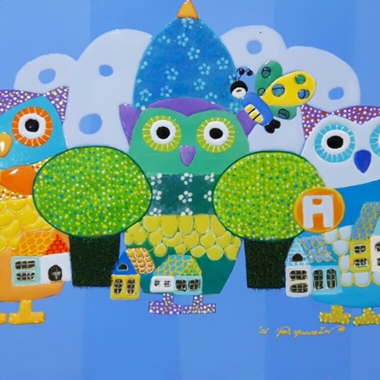 • [작가노트] 본인의 작품제작의 주제는 자연이며 자연을 시각상의 대상으로 보지 않고 작가가 경험하는 자신의 감각과 느낌을 형상화 시키고 있다. 최근 작품에는 강아지가 등장하는데 나와 함께 오랜 시간을 함께한 그림자와도 같은 존재이다. 강아지와 음악은 나의 삶에 행복을 가져다주고 평생을 같이할 동반자의 개념이다. 강아지에 대한 작가의 무한한 사랑을 다소 의인화시켜 밝고 화면속에서 친숙하게 표현하면서 그것들로부터 느껴지는 따스한 행복감들을 작가만의 캐릭터로서 이미지화 하였다. 작품기법면에서는 강아지 형상에다가 작가만의 자연을 바라보는 느낌을 콜라쥬와 물감 그리고 다른 친숙한 미디어 재료들을 이용했으며 화려하면서도 밝은 색조로서 구성하여 보았다. 현대적인 느낌을 살리기 위한 resin 작업도 병행하였다. 작품 속에 작은 동화 이야기와도 같은 맑고 깨끗한 숨겨진 이야기를 넣어 사람들의 마음속에 더욱더 친숙한 존재로서 다가오도록 하였다. 화면 위에서 펼쳐지는 색면의 움직임들은 마치 우주라는 공간 안에서 음악의 연주를 연상시키는 듯 그들만의 언어로서 특별한 관계를 만들어내게 되고 신비로운 모종의 느낌과 이미지를 탄생시키게 된다. 윤곽을 만들어내는 과정을 더하면서 작품의 풍부한 표정이 탄생되고 작품의 전체적인 느낌도 다가오게 된다. 작가는 보다 원색적이면서도 화려한 색깔을 자주 이용하는데 행복감의 표현을 화려한 색채로서 표현하고자 하였다. 기존의 나의 비구상 작품에서 보여지는 상징적인 표현도 역시 자주 등장하게 되는데 작가가 즐겨 표현하는 원과 같은 둥근 이미지는 작가만의 아이콘과 같은 기호라고 말하고 싶다. 둥근 이미지가 주는 느낌은 음악의 리듬, 음표, 자연의 순환, 행복의 느낌들이라고 말할 수 있겠다.