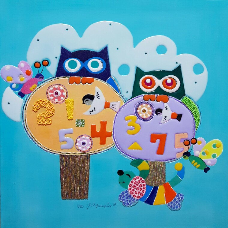 • [작가노트] 본인의 작품제작의 주제는 자연이며 자연을 시각상의 대상으로 보지 않고 작가가 경험하는 자신의 감각과 느낌을 형상화 시키고 있다. 최근 작품에는 강아지가 등장하는데 나와 함께 오랜 시간을 함께한 그림자와도 같은 존재이다. 강아지와 음악은 나의 삶에 행복을 가져다주고 평생을 같이할 동반자의 개념이다. 강아지에 대한 작가의 무한한 사랑을 다소 의인화시켜 밝고 화면속에서 친숙하게 표현하면서 그것들로부터 느껴지는 따스한 행복감들을 작가만의 캐릭터로서 이미지화 하였다. 작품기법면에서는 강아지 형상에다가 작가만의 자연을 바라보는 느낌을 콜라쥬와 물감 그리고 다른 친숙한 미디어 재료들을 이용했으며 화려하면서도 밝은 색조로서 구성하여 보았다. 현대적인 느낌을 살리기 위한 resin 작업도 병행하였다. 작품 속에 작은 동화 이야기와도 같은 맑고 깨끗한 숨겨진 이야기를 넣어 사람들의 마음속에 더욱더 친숙한 존재로서 다가오도록 하였다. 화면 위에서 펼쳐지는 색면의 움직임들은 마치 우주라는 공간 안에서 음악의 연주를 연상시키는 듯 그들만의 언어로서 특별한 관계를 만들어내게 되고 신비로운 모종의 느낌과 이미지를 탄생시키게 된다. 윤곽을 만들어내는 과정을 더하면서 작품의 풍부한 표정이 탄생되고 작품의 전체적인 느낌도 다가오게 된다. 작가는 보다 원색적이면서도 화려한 색깔을 자주 이용하는데 행복감의 표현을 화려한 색채로서 표현하고자 하였다. 기존의 나의 비구상 작품에서 보여지는 상징적인 표현도 역시 자주 등장하게 되는데 작가가 즐겨 표현하는 원과 같은 둥근 이미지는 작가만의 아이콘과 같은 기호라고 말하고 싶다. 둥근 이미지가 주는 느낌은 음악의 리듬, 음표, 자연의 순환, 행복의 느낌들이라고 말할 수 있겠다.