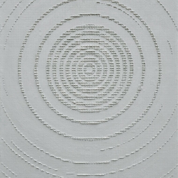 • [작가노트] 관계 인간은 자연과의 어우러짐 속에서 그 근원을 점과 선을 통해 찾을 수 있으니... 끊임없이 이어지는 삶의 카테고리 속에서 반복의 질서를 통해 우주의 근본을 찾을 수 있을 것이다. 생명의 탄생과 반복적 경험을 점과 선을 통해 이야기하고자 한다. 끊임없이 이어지는 삶의 반복적 질서를 몸소 재현하듯 펼쳐진 펄프 위에 반복적 행위 속에서 드러나는 점 또는 선의 요철을 통해 자연과 호흡하고자 했으며, 그 공기는 리듬을 타고 이어진다. 주재료인 한지는 재료라는 개념과 작품의 개념이 분리되는 것이 아니라 그 자체로 작품이 되는데, 이는 곧 ‘바탕재료’적인 측면과 그 자체가 작품화 되는 ‘오브제’적인 두 가지 측면을 동시에 지니고 있다. 이러한 한지의 물성은 곧 작품 본연의 존재방식이라는 메시지가 되어 작품의 독자적인 매체로 작용하게 된다. 평면에서의 파장의 원을 입체적으로 표현함으로써 내면과 외면의 동일성을 보여줌과 동시에 음과 양의 조화를 꾀하고자 하였다.