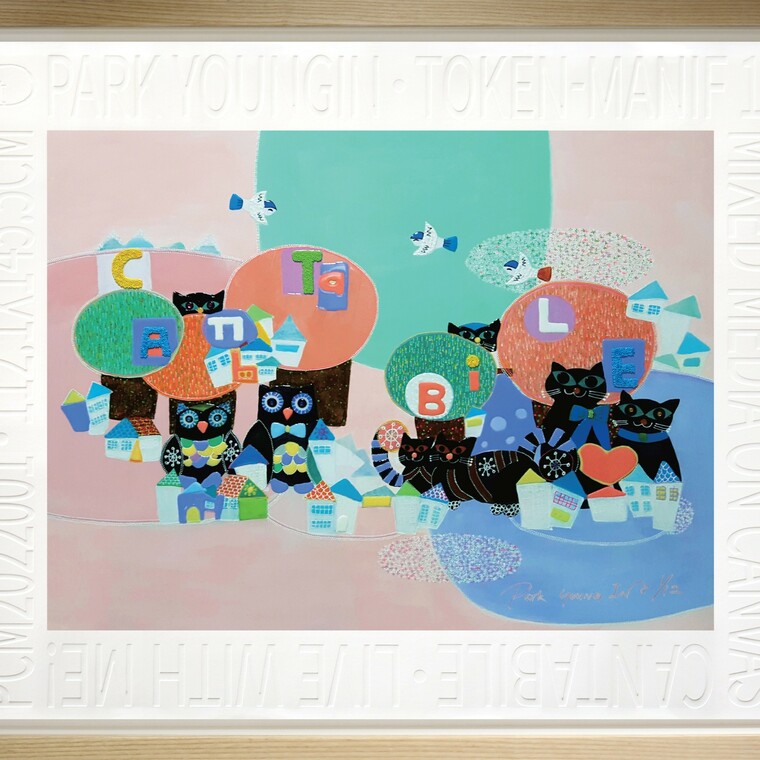 • [작가노트] 본인의 작품제작의 주제는 자연이며 자연을 시각상의 대상으로 보지 않고 작가가 경험하는 자신의 감각과 느낌을 형상화 시키고 있다. 최근 작품에는 강아지가 등장하는데 나와 함께 오랜 시간을 함께한 그림자와도 같은 존재이다. 강아지와 음악은 나의 삶에 행복을 가져다주고 평생을 같이할 동반자의 개념이다. 강아지에 대한 작가의 무한한 사랑을 다소 의인화시켜 밝고 화면속에서 친숙하게 표현하면서 그것들로부터 느껴지는 따스한 행복감들을 작가만의 캐릭터로서 이미지화 하였다. 작품기법면에서는 강아지 형상에다가 작가만의 자연을 바라보는 느낌을 콜라쥬와 물감 그리고 다른 친숙한 미디어 재료들을 이용했으며 화려하면서도 밝은 색조로서 구성하여 보았다. 현대적인 느낌을 살리기 위한 resin 작업도 병행하였다. 작품 속에 작은 동화 이야기와도 같은 맑고 깨끗한 숨겨진 이야기를 넣어 사람들의 마음속에 더욱더 친숙한 존재로서 다가오도록 하였다. 화면 위에서 펼쳐지는 색면의 움직임들은 마치 우주라는 공간 안에서 음악의 연주를 연상시키는 듯 그들만의 언어로서 특별한 관계를 만들어내게 되고 신비로운 모종의 느낌과 이미지를 탄생시키게 된다. 윤곽을 만들어내는 과정을 더하면서 작품의 풍부한 표정이 탄생되고 작품의 전체적인 느낌도 다가오게 된다. 작가는 보다 원색적이면서도 화려한 색깔을 자주 이용하는데 행복감의 표현을 화려한 색채로서 표현하고자 하였다. 기존의 나의 비구상 작품에서 보여지는 상징적인 표현도 역시 자주 등장하게 되는데 작가가 즐겨 표현하는 원과 같은 둥근 이미지는 작가만의 아이콘과 같은 기호라고 말하고 싶다. 둥근 이미지가 주는 느낌은 음악의 리듬, 음표, 자연의 순환, 행복의 느낌들이라고 말할 수 있겠다.