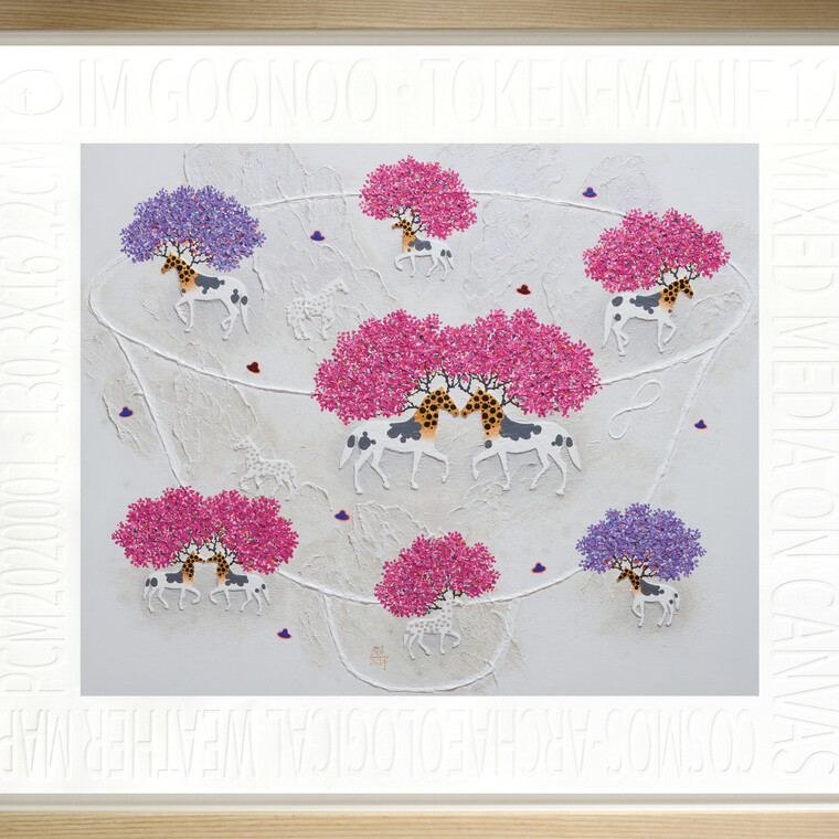 • [평론] 임근우의 유토피아를 꿈꾸는 ‘Cosmos-고고학적 기상도’ <말+젖소+기린>의 ‘유토피아 캐릭터’는 이상형동물 머리에 복숭아꽃을 활짝 피우고, 도원경(桃源境) 속에서 고고학적 무릉도원을 부유하며 꿈꾸는 ‘이시대의 행복 기상도’이자 현대판 <행복십장생도>이다. 그림에 등장하는 <말+젖소+기린>의 ‘유토피아 캐릭터’는 현대인이 꿈꾸는 이상형의 동물로서 역동성의 상징인 말과, 풍요의 상징인 젖소, 그리고 큰 키의 장점을 가진 기린이 합하여진 행복 캐릭터이다. 다시 말하면 말은 건강을 의미하며, 젖소는 부를 의미하고 기린은 명예를 의미 한다. 건강과 돈, 그리고 명예 이 세 가지를 가진 이상형 동물의 머리에서 나무가 자라나고 그 위에 복숭아 꽃을 피운 ‘유토피아 캐릭터’가 살고 있는 곳이 무릉도원이다. 땅에 뿌리를 내리고 사는 식물로서의 복숭아 꽃이 아니라 동물의 머리에 핀 복숭아 꽃은 배달민족(?)답게 심산유곡 어디든 배달이 가능하다. 그것을 모두에게 배달하고 싶다. 이 시대의 무릉도원이자 현대판 <행복십장생도>에는 이상형 동물 외에도 녹차 다완(茶碗)과 고고학자의 중절모자, 하트 무한대 도형, 간절히 기도하고 있는 나의 모습 등이 구름 기상도처럼 둥실둥실 떠다니며 자유로운 고고학적 시간여행을 즐기고 있다. 이 또한 모두와 함께 자유여행을 하고 싶다.