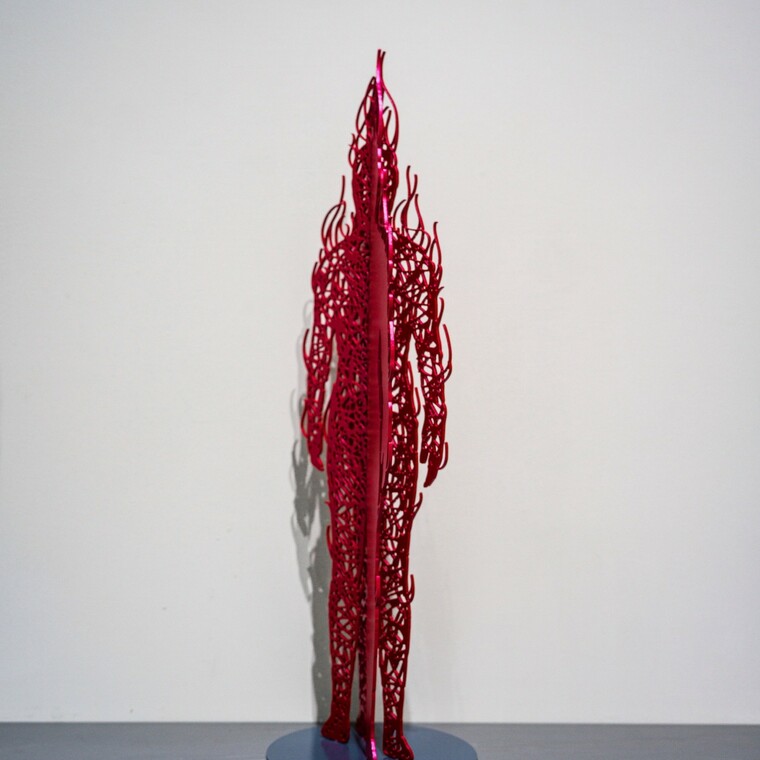 • [작가노트] Space IDEA 2025 – 본질의 사유(김정희) 몇 해 전, 지인이 건넨 오래된 수세미 하나가 내 작업의 방향을 근본적으로 뒤흔들었다. 말라버린 껍질 속, 얽히고설킨 다층적 구조와 생의 흔적은 마치 오랜 시간 축적된 우주의 질서처럼 느껴졌다. 작은 자연물 안에 펼쳐진 복잡한 조형은 단지 생물학적 결과가 아닌, 생명과 공간, 시간과 구조가 맞물린 하나의 세계 질서였다. 그 순간, 공간은 내게 단순한 배경이나 조형의 무대가 아니라, 생명이 깃든 살아 있는 장(場)으로 다가왔다. 그것은 플라톤이 말한 ‘이데아의 세계’ 처럼, 물질 너머에 존재하는 본질을 향한 시각적 은유이자, 내가 조각이라는 매체로 도달하고자 했던 근원적 질문의 실마리였다. 조각가에게 공간은 늘 어려운 주제였다. 그러나 수세미를 통해 나는 공간을 단지 비워진 여백이 아니라, 에너지와 존재, 그리고 시간의 흔적이 교차하며 ‘의미를 생성하는 장’으로 바라보게 되었다. 이로써 조각은 실체의 구축이 아닌, 존재의 지각(Perception)과 그 본질을 포착하는 ‘사유의 조형’이 된다. 이번 전시 「Space IDEA 2025 – 본질의 사유」는 내가 지난 몇 년간 붙잡아온 근원적 질문들에 대한 응답이다. 나는 철사라는 선적인 재료를 통해 인체를 형상화한다. 그러나 그 안은 비어 있다. 비워낸 실체 위에 세워진 선들은 단지 형상을 구성하는 윤곽이 아니라, 보이지 않는 에너지의 흐름과 정신의 진동을 시각화하는 구조이다. 이는 단단한 육체를 해체하고, 그 너머에 있는 존재의 본질—즉 보이지 않지만 ‘느껴지는 것’—을 드러내려는 시도이다. 메를로-퐁티가 말한 것처럼, 우리는 세계를 보는 것이 아니라 느끼며 인식한다. 내 조각 속 ‘비워진 인체’는 그 자체로 지각의 대상이기보다는 지각의 장이 된다. 선들은 그 장 안에서 정신의 흐름, 시간의 압축, 그리고 무의식의 떨림을 시각화한다. 특히 이번 전시에서는 수세미에서 출발한 철사 조형물을 통해, 인간과 자연, 그리고 우주의 상호 연결성과 순환성을 보다 직접적으로 드러내고자 했다. 그물망처럼 구성된 철사 구조는 들뢰즈가 말한 리좀(rhizome) 구조를 떠올리게 한다. 위계나 중심 없이 끝없이 퍼지고 얽히는 선들 속에서, 나는 생명과 시간, 존재의 흔적을 직조해낸다. 공간에 전시된 작업에서는 인간과 자연, 자아와 타자, 실재와 상상의 경계가 모호하게 뒤섞이는 지점을 형상화했다. 뫼비우스의 띠를 연상케 하는 조형 구조 속, 한쪽은 인간의 형상, 반대편은 추상화된 인물로 구성되어 있다. 이 구조는 대립적 이항을 넘어서, 존재가 고정되지 않고 끊임없이 생성되고 변화하는 **과정적 존재성(being-in-process)**을 이야기한다. 작품은 관객의 시선을 되돌려 ‘나’를 보게 하며, 인식과 지각의 주체로서의 자신을 다시 자각하게 만든다. 나는 관객이 단지 작품을 보는 존재가 아니라, 작품에 의해 ‘보이는 존재’가 되기를 바란다. 결국, 이 모든 작업은 ‘나’라는 존재로부터 출발한다. 나의 의도와 상관없이, 타인의 시선은 새로운 해석을 만들어낸다. 플라톤의 이데아가 감각 세계를 넘어선 참된 실재라면, 나는 그 감각과 실재 사이의 간극을 철사의 선으로 연결하고자 한다. 이번 전시는 나에게 있어 하나의 전환점이다. 조각이라는 매체를 통해 자연의 생명성과 인간 존재의 깊이를 동시에 사유하고자 했다. 그 속에서 공간은 단지 형상을 담는 그릇이 아닌, 존재와 에너지가 끊임없이 충돌하고 생성되는 철학적 무대가 된다. 이 작업들이 관객에게도 본질에 대한 질문을 던질 수 있기를 바라며, 멈춰 서서, 그 선들과 공간 사이에서 ‘자신’이라는 존재를 새롭게 마주하게 되기를 바란다. 그것이 바로, 내가 이 조각을 통해 그리고자 한 사유의 여정이다.