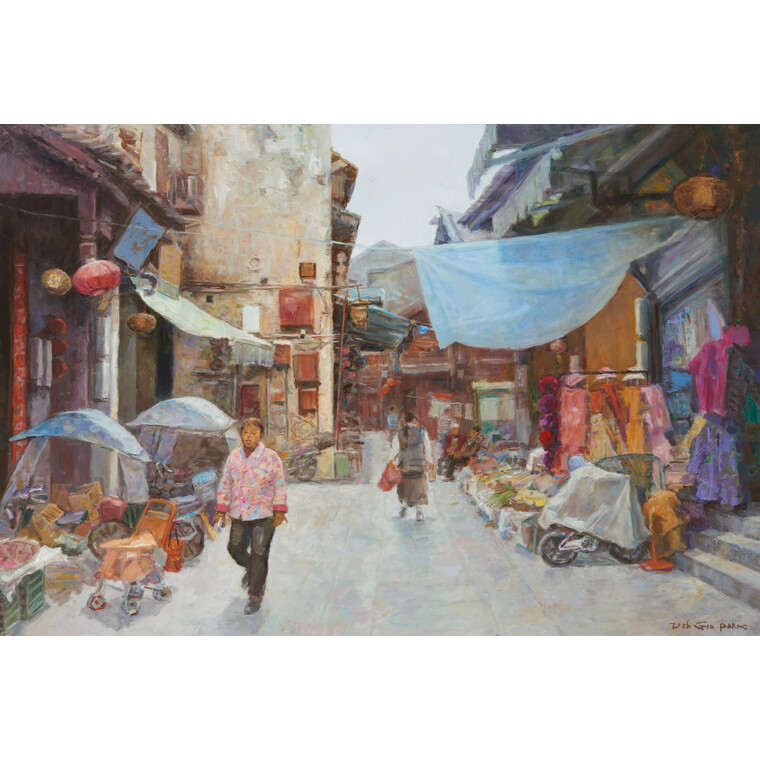• [평론1] 삶에 대한 기쁨과 감사와 행복의 언어를 보여주는 작가 박지오 박지오는 우리 미술계의 큰 축을 이루고 있는 구상미술 작가의 일원이면서도 독특한 자기 세계를 확립한 작가로 평가되고 있다. 구상 작가들의 작업이 그렇듯 그 역시 자연과 풍경을 표현해 내고 있다. 그러나 박지오의 풍경은 정경에 대한 사실적 묘사에 치중하기 보다는 풍경들이 지닌 내면적 함의, 즉 눈으로 읽을 수 없는 행간의 모습과 뜻을 담아내고 있다. 그 풍경들은 무척 인간적이고 인생적이다. 수려한 자연 풍광이나 화려한 도시 풍경이 아닌, 서민적인 거리 풍경, 즉 인간의 삶이 서로 섞이고 녹아드는 애환의 정경을 담아내고 있는 것이다. 그래서 그의 화면은 낯익고, 마치 우리들의 삶에서 경험하는 일상들이 자연스럽게 펼쳐져 있다. 작가적 정신과 테크닉이 잔잔하면서도 탄탄하게 조율되고 있는 것이 박지오 조형의 매력이라 할 수 있다. 서민의 낮은 풍경들이지만 거기엔 생에 대한 따뜻한 포옹과 시선이 면면히 배어 있다. 생에 대한 긍정적인 바라봄, 삶에 대한 기쁨과 감사와 행복의 언어가 밀도 있게 엮여져 색깔로 풍경과 사물에 옷을 입히는 그의 작업은 새로운 구상주의, 새로운 자연주의 작가로서 그를 떠올리게 하고 있다. 생의 숨결이 배어나는 화면을 통하여 그가 서술해가는 인간의 이야기는 신신한 자연의 생명력과 더불어 그의 조형을 지키는 축이 된다. 그만큼 그의 화면에선 인간 박지오의 체취가 물씬 풍겨 나온다 유석우(미술시대주간) [평론2] 또 다른 욕구를 위한 여명의 신호 - 화가 박지오의 작품 세계에 대한 존재론적 소고 작가의 풍경들은 응시자에게 전혀 낯설지 않고 오히려 어디서 많이 본 익숙한 장면들 - 예컨대 시장 풍경, 거리 풍경, 군상들, 산동네 풍경, 비탈진 골목길, 변두리 한적한 도로, 버스 정류소, 화가 자신이 살았거나 현재 살고 있는 동네 풍경 - 등과 같이 누구나 경험하는 일상의 단면들로 나타난다. 그러나 장면들은 엄밀히 말해 현실의 단순한 묘사나 재현이 아니라 과거 자신이 경험한 기억의 인상으로부터 다시 재구성된 현실로 이해된다. 이때 이미지를 이해하는 가장 중요한 것은 그림 행위 그 자체와 시각적인 정보가 아니라, 그 행위에 앞서 일어난 어떤 비밀스런 생성(genese), 즉 자신도 분명히 인지할 수 없는 어떤 느낌으로서 대상과의 강렬한 교감이다. 이러한 형이상학적인 원인을 존재론적으로 스팀뭉(stimming)이라고 한다. 이것은 유일하게 느낌의 어조 혹은 음색(tonalite)으로 번역되는데, 특별히 작가들이 실행하는 예술적 행위에 있어 가장 원천적인 무엇이 된다. 또한 우리가 작품이라고 하는 것은 바로 이러한 형이상학적인 존재가 물질로 전이(轉)된 것을 말한다. 특히 “화가는 그때 거의 영감(신의 계시)으로부터 행동한다. 형이상학적 경험이라는 의미에서 그림은 화가가 화폭을 이젤에 놓기도 전에 그리고 색의 연금술이 정리되기도 전에 이미 시작된다.(...)그림은 스팀뭉의 찰나(instant)를 가지자마자, 작가의 기억소생으로 진행된다. 그래서 스팀뭉의 발견은 우선적으로 작가에게 생성을 자생하는 의미를 가진다.” 스팀뭉의 물질적인 재생은 작품의 진행 과정 특히 표현주의 계열의 작품에서 보다 분명히 나타난다. 그림의 내부적 주제는 작가가 그림을 그리기 이전에 이미 잉태되고, 흔히 자신의 순수 기억이나 또 다른 환상의 욕구로서 레미니센스는 이러한 주제의 배경이 됨과 동시에 화가가 가장 먼저 활용하는 중요한 대상이 된다. 예를 들어 폴클레(Paul Klee)의 “음악의 그래픽적 전이”나 마르셀 프루스트(Marcel Proust)의 마들렌 과자가 유발하는 무의식적 기억은 사실상 작가의 기억소생을 통한 상황적인 음색의 재구성이라고 할 수 있다. 이러한 맥락에서 볼 때 작가의 풍경은 더 이상 있음직하지 않은 기억의 재구성 즉 “스팀뭉과 영혼의 결정적 찰나(instant accorde)”로서 스팀뭉겐(Stimmungen)의 흔적으로 나타난다. 그러나 여기서 말하는 결정적 찰나의 포착은 관념적이고 초월적인 것이 아니라 완전히 내재적인 것이다. 왜냐하면 이러한 찰나는 비록 인간의 제한된 감각으로 도달하지 못하지만 현실적으로 누구 경험할 수 있는 “내부적 경험(experience interieure)"이기 때문이다. 그래서 이러한 지시적인 그림을 이해하는데 있어 우선적으로 고려해야 하는 것은 이미지가 외시하는 논리적 진술이 아니라 그 그림을 있게 한 형이상학적인 순수 출현 즉 모든 예술적 재현 행위가 시작되는 제로 단계로서 작가의 내부적 경험이다. 이 경험은 우리에게 말하자면 우리가 좋아하는 음악을 들을 때 그 음악에 대하여 전혀 논리적 이유를 달지 않는 순수 그 자체의 즐거움이나 희열을 준다. 그래서 작가가 사실주의 풍경을 통해 우리에게 보여주는 실질적인 메시지는 결코 작가의 경험적인 울타리를 벗어나지 않는다. 그는 그림 행위가 반복되는 과정에서 자신의 삶과 경험이 작품에 은밀히 침투하여 자신도 모르는 일종의 “무의식적 시선(vision inconsciente)"을 발견한다. 작가는 ”사람들이 무심코 지나쳐 버리는 하찮은 것과 초라하고 낡은 풍경이라 할지라도 세한 빛과 색 속에 