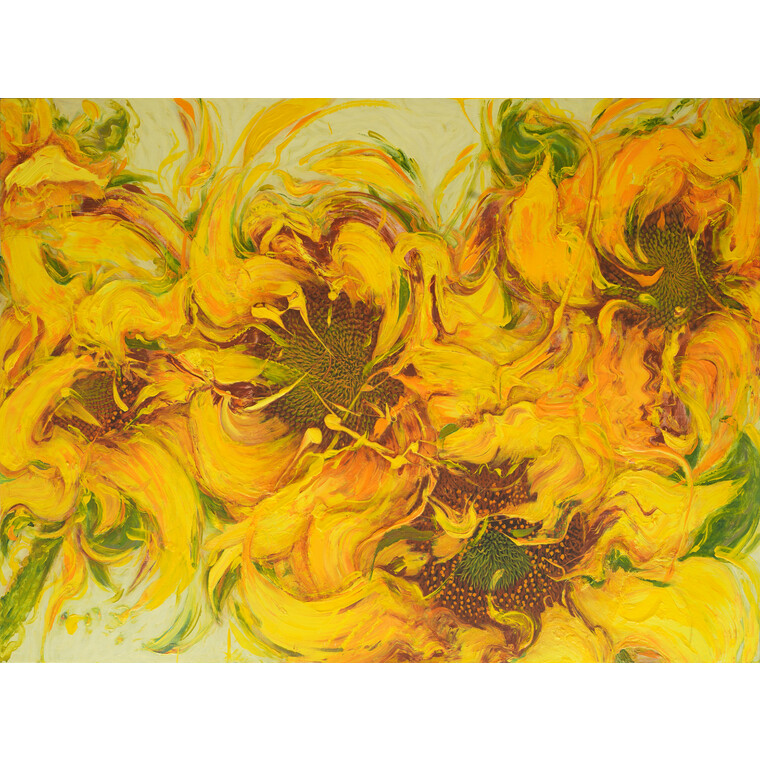 • [작가노트] 흔들리는 해바라기, 흔들림은 발산이고 움직이며, 그것은 모든 생명의 에너지이다. 한 여름 뙤약볕을 안고 목을 길게 빼어 태양을 바라고 있는 해바라기는 열정과 인내와 연모의 상징이다. 적극적이고 진취적인 태양을 닮아가는 해바라기는 나에게 위엄과 열정으로 다가왔다. 어려운 환경을 극복하고 화려하게 피어나는 해바라기는 나의 성격과 인생행로와 닮아 사랑하지 않을 수 없다. 무엇보다 그 열정적인 해바라기가 바람에 휘날리는 모습을 보고 느끼고 그림으로 표현할 때마다 내가 살아있고 자유로움을 느낀다. 속도와 힘을 실은 붓질(brushing)이나 자유로운 손가락 작업, 흩뿌려진 얼룩점은 내 기질의 소산(所産)이며 나의 감성과 사유를 표현하기 위한 형식적 요소로서 언제나 작용한다. 이러한 조형적 형식 속에 해바라기는 바람을 만날 때 더 열정적 에너지와 강렬한 생명력의 이미지로 용융(熔融)되어있다. [평론] 윤옥순의 작품세계는 동양의 사유세계에서 말하는 우주 만물의 원리이자 근원인 “이(理)와 기(氣)”, 그중에서도 기(氣)”의 조형화에 있다. 그의 예술세계를 구축하는 생명의 근원으로서의 기(氣)”를 열정의 이미지로 표현하는 데 있다. 윤옥순 작가의 작업은 무엇보다 속도감이 느껴지는 빠른 붓질로 시작되는 움직임이나 호흡을 암시하는 듯한 이미지, 그리고 붓질은 우주의 충만한 에너지 혹은 우주 만물의 근원적인 힘의 흐름과 또 화면의 구성이나 여백의 활용에 있어서도 매우 동양적이다. 즉 기본적으로 이미지를 모티브로 하되 그것을 붓글씨 쓰는 서체의 느낌으로 당기고 끌어올리는 패턴을 구사하면서 공간을 배려하고 있다. 그러면서도 즉흥적이고도 고조된 감성에 의존한다. 자유분방하고 분출하는 듯한 그의 붓질은 인간 내면의 깊은 곳에서 일어나는 원초적이고도 강렬한 열정의 표출로써 회화 이상의 또 다른 생동감을 준다. 그녀의 붓질은 우주에 충만한 에너지 혹은 우주 만물의 근원적인 흐름을 자기만의 조형 언어로 표현한 것이다. 그녀가 구성한 독특한 화면의 형태들은 기본적으로 률과 함께 생명감을 보여주는 열정의 이미지이다. -개인전서문(2003)중에서 김종근 미술평론가